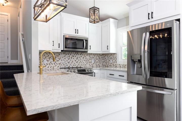 +"PublicRemarks": "Absolutely stunning and QUALITY remodel! Through the front door you are greeted with an open and airy living/kitchen/dining space that offers LVT flooring, vaulted ceilings, gorgeous accent wall, windmill ceiling fan, kitchen that boasts custom cabinets with soft-close drawers and doors, quartz counters, stainless steel appliances (induction cooktop, LG fridge stays), tons of counter space plus breakfast bar! Spacious, finished walkout basement offers plenty of space to spread out and entertain with a wetbar and NEW full bathroom! Adorable and LARGE (24x11) shed with loft space has tons of storage space and ready to be transformed to the he shed/she shed you've been dreaming of! Extra deep garage with bluetooth opener. New slider installed off kitchen that walks out to large patio plus basement walkout as well! All new bathrooms with tiled showers, fresh interior and exterior paint, NEW windows, HVAC, water heater and electrical, newer roof and so much more!! Truly a turn-key property, nothing to do but move in!! Located on nearly 1/3 acre, fenced and treed (some fruit trees, YUM) lot on a quiet street within the Park Hill School District. Close proximity to major highways, shopping, schools, restaurants and just minutes from the new airport and downtown KC!"