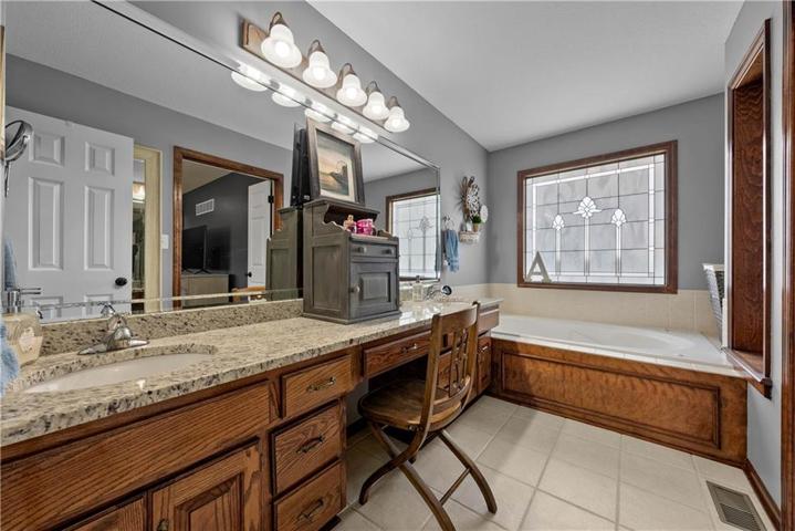 The kitchen is a chef’s delight with granite countertops, large island, stainless steel appliances, soft-close drawers, and a large pantry with a built-in electrical outlet.\r\n