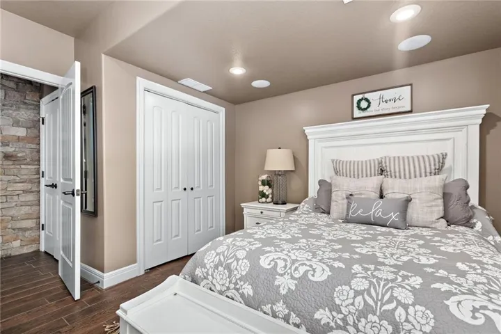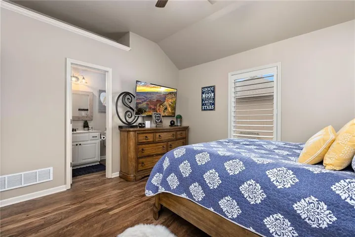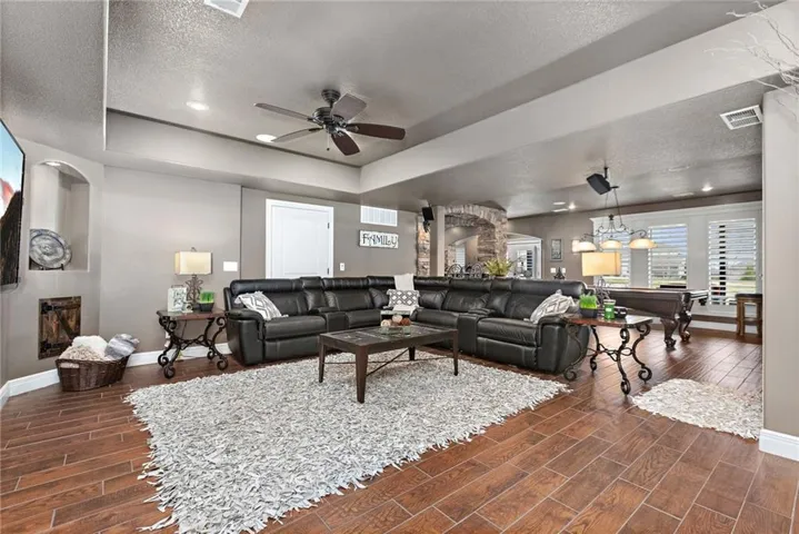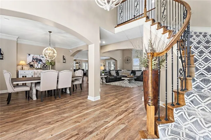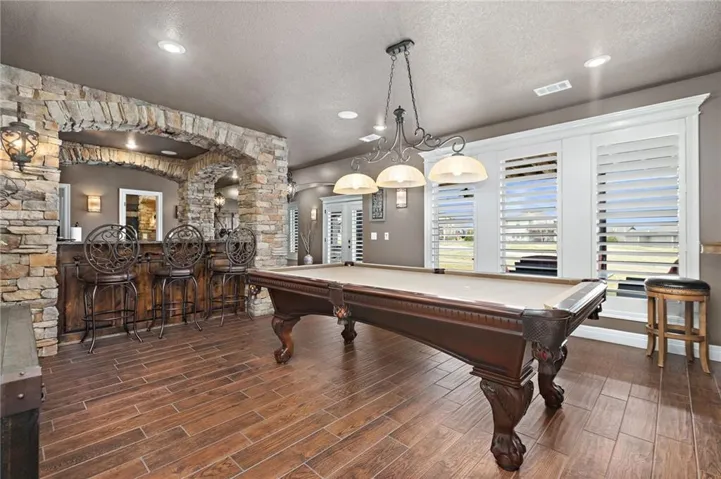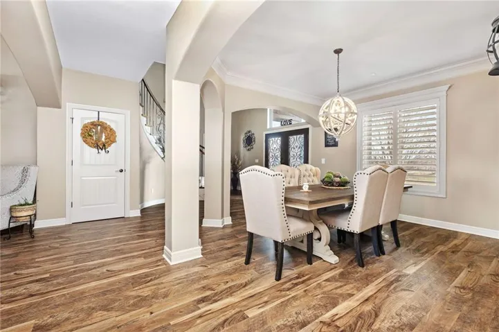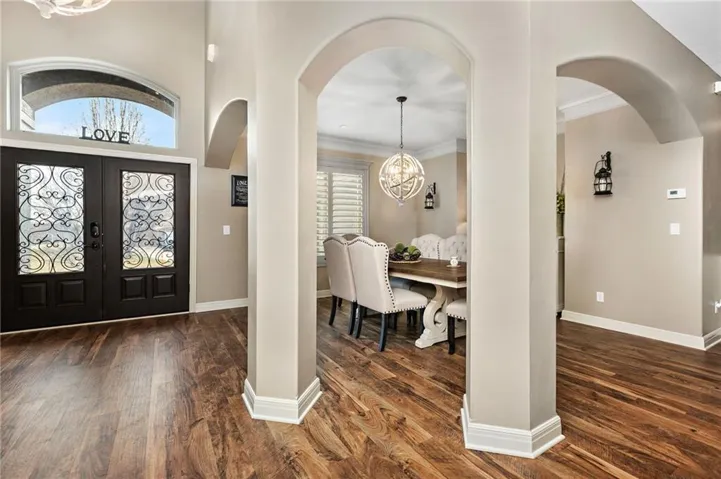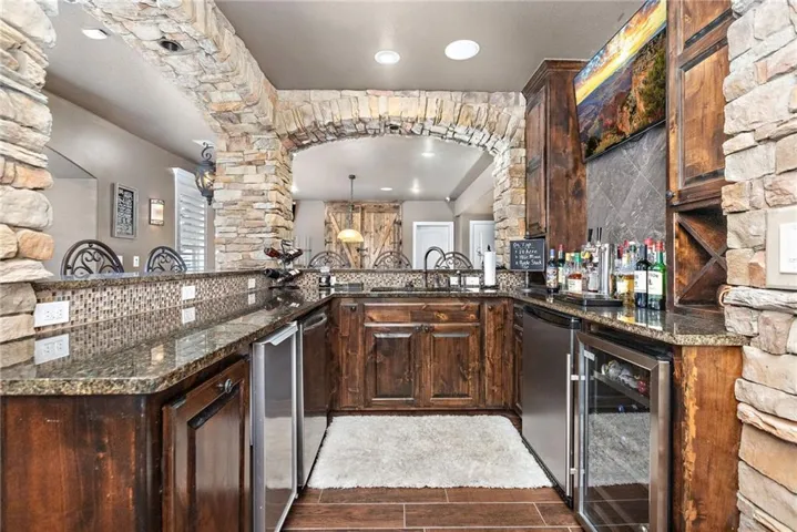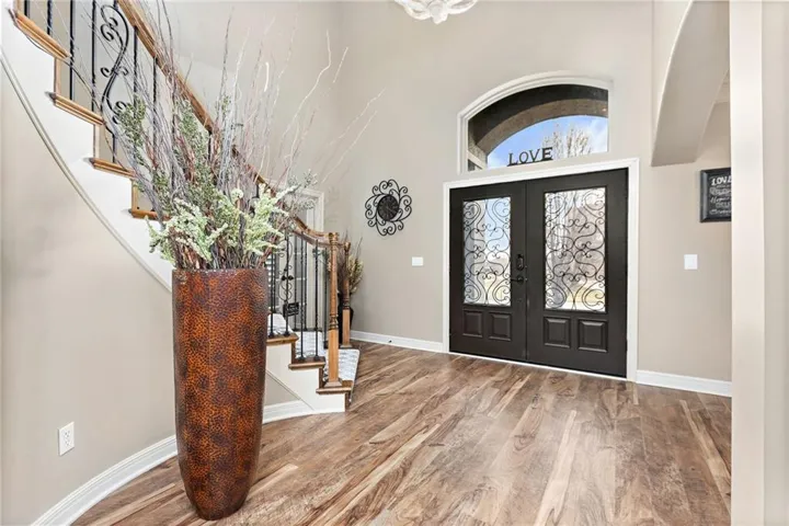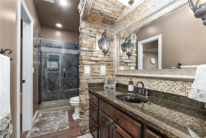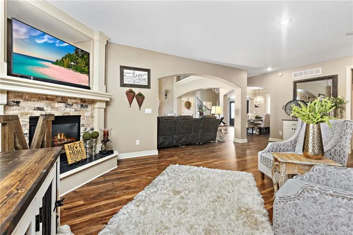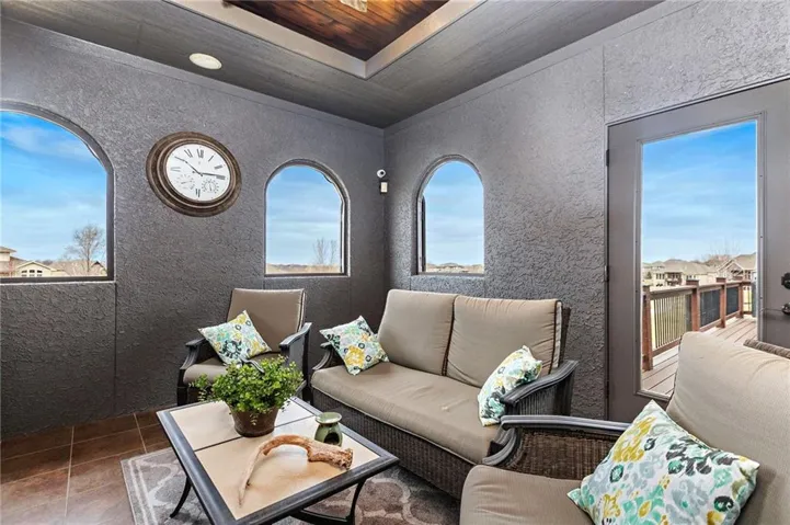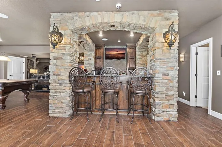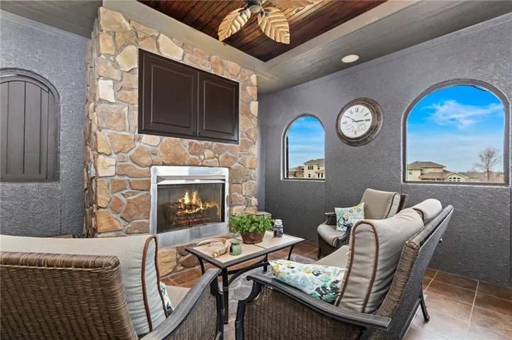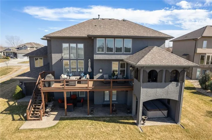 +"PublicRemarks": "An ABSOLUTE MUST SEE. This magnificent two story sits on the tee box of hole #22 of Shawnee Country Club Golf Course in the desirable GREENS OF CHAPEL CREEK. Zoned to award winning DeSoto School District. All sides stucco with a grand front entry door. Plantation shutters throughout. Beautifully designed and recently remodeled kitchen and master bath, it boasts luxury vinyl plank flooring throughout. Nearly 5000 square feet of living space gives you plenty of main level space with an attached 4 season Lanai with fireplace and TV to enjoy year-round. 5 bed/4.5 baths with a bonus main floor office space. The kitchen is open with granite countertops and stainless appliances that stay with the home. 9 zone in-ground sprinkler system, 2 hot water heaters, 2 air conditioning/heating units (main and upper). Lower level finished in 2014, includes 1 bedroom, 1 bathroom, wet bar, living room, exercise room, game area, tile floor, built-ins and cabinets. Keg refrigerator with through counter taps, dishwasher, garbage disposal, wine fridge. Extensive stone design in bar and bath. 12 zone whole house audio system with video distribution matrix switch and outdoor under deck speakers. Extensive CAT5 cabling throughout home. 32 zone Elk M1 Gold Security/Automation System with motions, door contacts, glass break sensors, 3 speakers/sirens. 16 camera video surveillance system with indoor and outdoor cameras. House exterior painted in 2023. 3 car oversized garage and 4th garage in basement for golf cart/storage. So many updates and upgrades you don’t want to miss out!!"