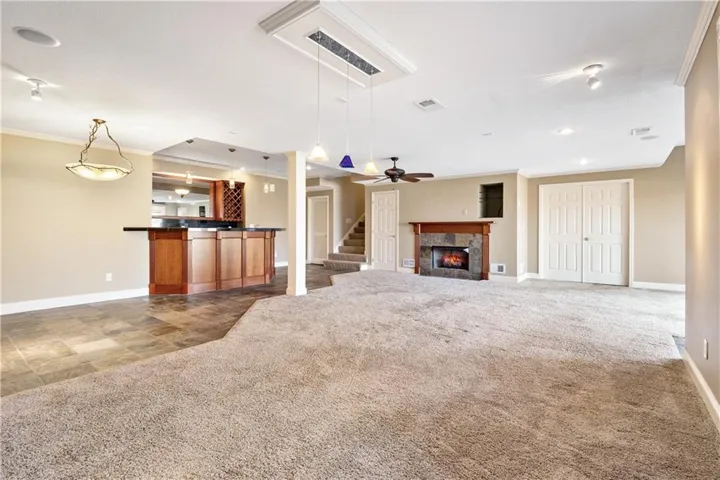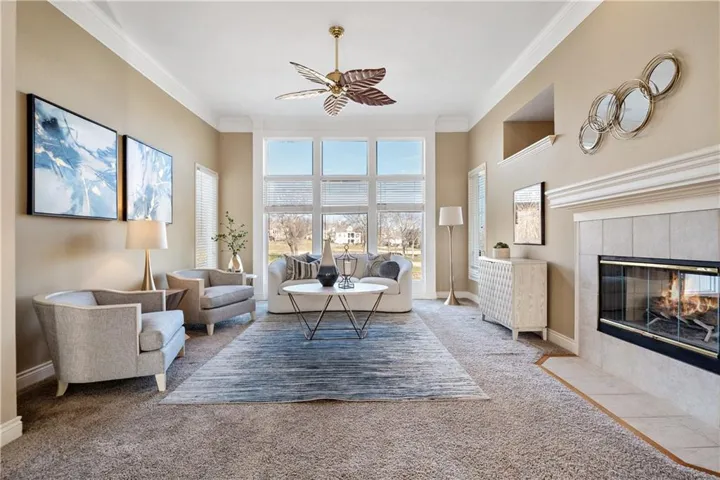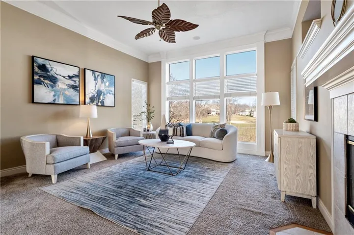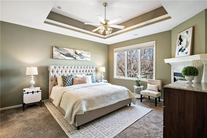 Nestled in the esteemed Falcon Ridge Villas of Lenexa, KS, this luxurious 4-bedroom, 3.5-bathroom home offers an idyllic blend of elegance and comfort with breathtaking views of a lush golf course. The residence showcases exceptional design, featuring a unique see-through fireplace that enhances both the living and hearth rooms, alongside a wet bar for effortless entertaining. Special amenities include an upstairs loft, a master suite with a cozy fireplace and a bidet for an added touch of luxury, and a newly installed cedar deck for serene outdoor living.\r\n