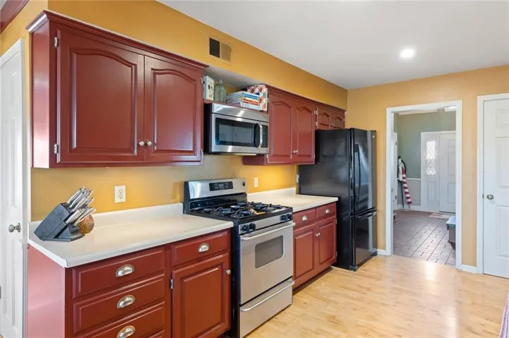 "LongDescription" => "Kitchen featuring stainless steel appliances, brown cabinets, light countertops, and a textured ceiling"