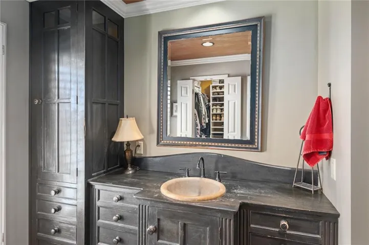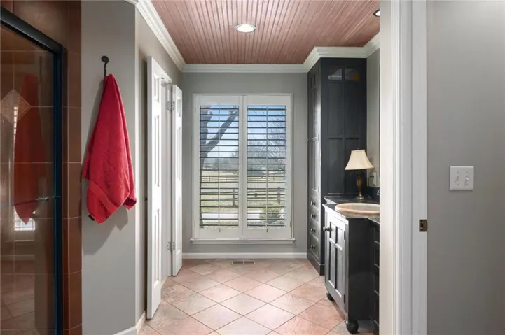 "LongDescription" => "Bathroom featuring vanity, tile walls, wallpapered walls, a textured ceiling, and wainscoting"