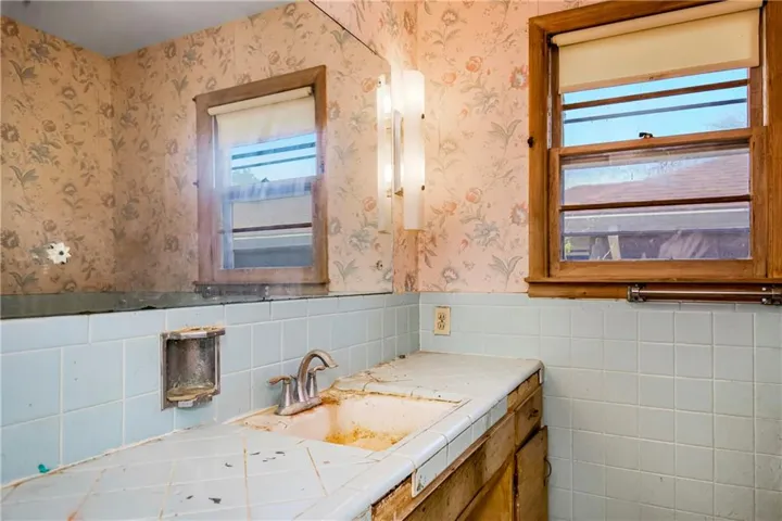 "LongDescription" => "Full bath with plenty of natural light, vanity, a shower stall, a textured ceiling, and tile walls"