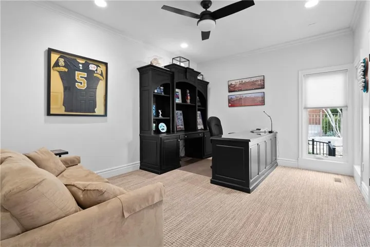 "LongDescription" => "Office area featuring wooden walls, hardwood / wood-style flooring, and crown molding"