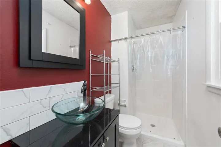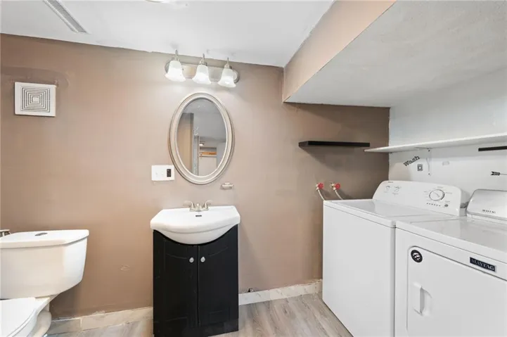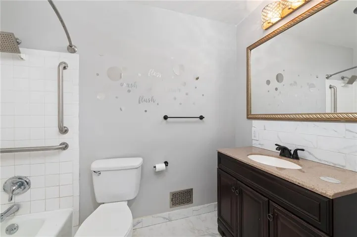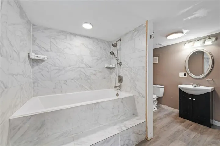 "LongDescription" => "Full bathroom with vanity, tile walls, plenty of natural light, and dark wood-type flooring"
