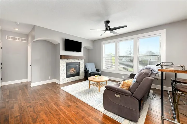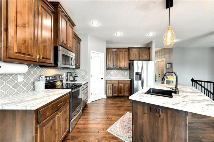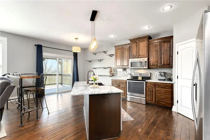 +"PublicRemarks": "Outstanding Ranch / Reverse with upgraded finishes throughout! Home features a 3 car garage and preferred location in Gardner, for easy access to shopping and highway. Inside, you'll love the hand-scraped hardwood floors, walk-in pantry, and modern and well thought out layout, featuring master suite connected to large laundry room, 2nd bedroom and full bathroom on main level, plus family room, 2 bedrooms and full bathroom in finished lower level. Covered and uncovered deck walk out to fenced backyard with firepit."