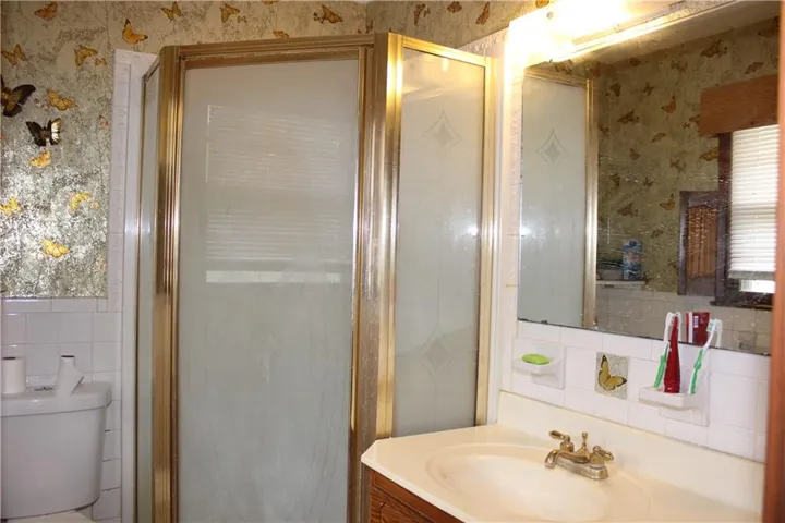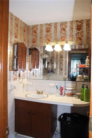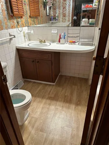 "LongDescription" => "Full bathroom with vanity, tile walls, plenty of natural light, and dark wood-type flooring"
