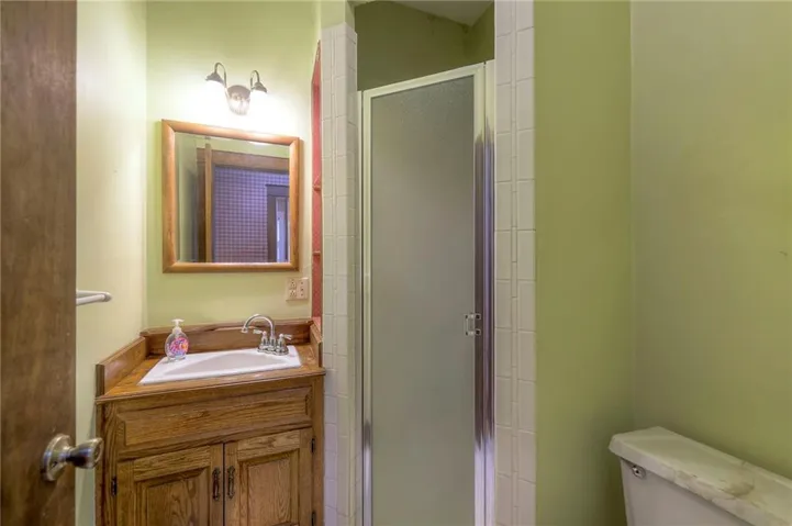 "LongDescription" => "Full bath featuring vanity, dark wood finished floors, wainscoting, tile walls, and a shower"