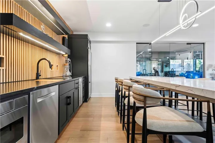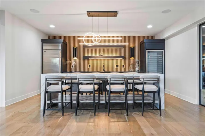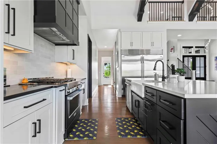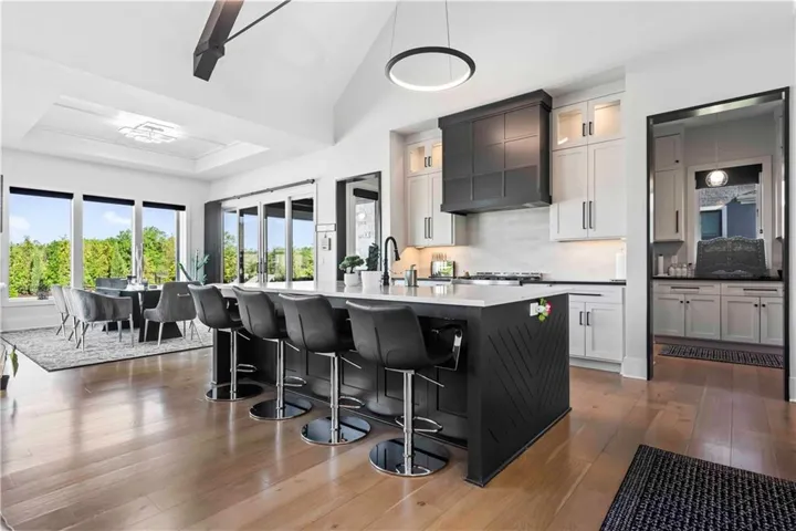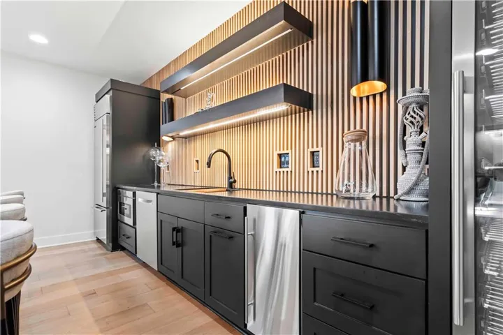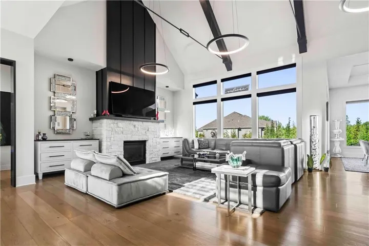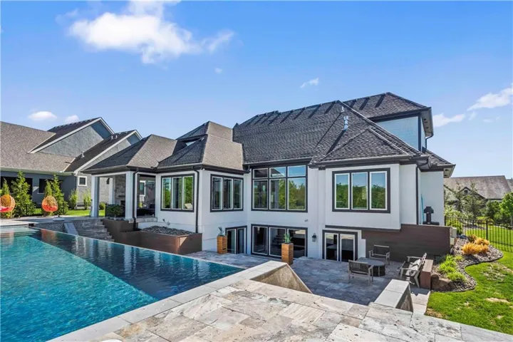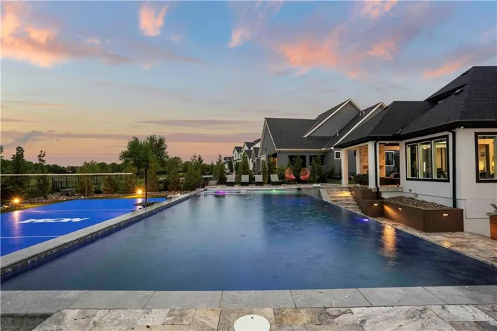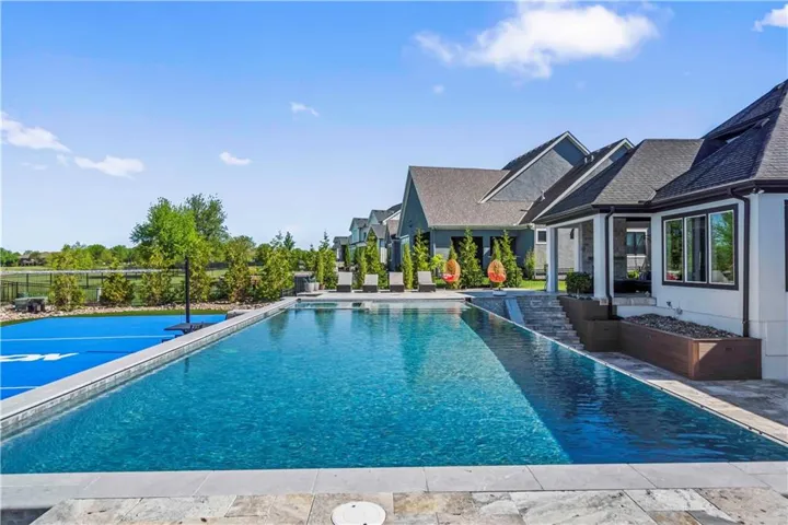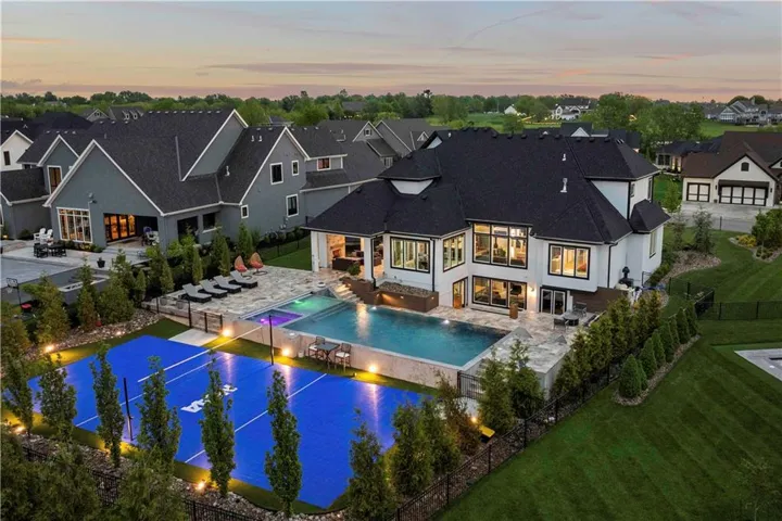 +"PublicRemarks": "You don't want to miss this stunning 1.5-story home designed for indoor and outdoor entertaining. An incredible location for those looking for Southern JoCo conveniences, near the Johnson County Executive airport and all that the 159th st. corridor has to offer, with so many new businesses and amenities right down the road. You are greeted as you enter the home by soaring ceilings adorned by brand new unmatched lighting and wide-plank hardwood floors. The floor plan flows seamlessly, complemented by a stunning kitchen featuring Sub-Zero and Kitchen Aid appliances and a convenient walk-through butler's pantry. The main level offers a spacious secondary bedroom with ensuite on opposite wing of the home from main level owners suite. The owners suite has a giant walk-in-closet with 40",80", & 96" closet system for maximizing space and adding the wow factor. The en-suite bathroom feels like a day at the spa. The second level offers a generous sized open loft that can be used for a playroom, office, or reading area. Large bedrooms with walk-in closets and ensuite baths in every room on the 2nd floor. The lower level offers a large entertaining area, second kitchen with a full island you wont want to miss, state of the art gym, sauna, office, and another full bath. Outside, the backyard oasis features a covered patio with fireplace, infinity pool/spa that shows incredible in the evening with immaculate lighting features all around it surrounded by an outdoor bar with gas firepit, a sports court, and travertine decking all kept private by a perfectly treelined fenced yard. Recent upgrades such as all-new lighting throughout the interior and exterior, motorized blinds, a sonos speaker system throughout, and upgraded exterior and interior paint to bring a modern and sleek look to this home. 3rd car garage door heigh extended to make room for a car lift in the future. Your perfect home in Southern Lakes is finally available."