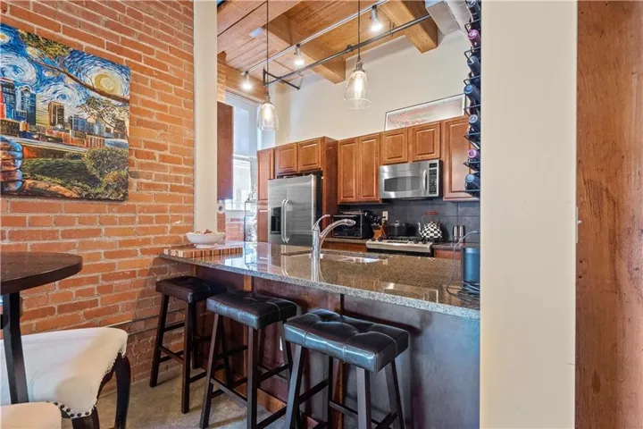 +"PublicRemarks": "Stunning 2 bedroom, 2 bathroom corner unit loft with large balcony in the heart of Downtown Kansas City! Located in the highly sought-after Fountains on Broadway building blocks from the River Market, restaurants, Power & Light, streetcar, and quick highway access! Unit offers an inviting open floor plan with tall heavy timber ceilings, rustic brick walls, all new lighting, new interior paint, and refinished concrete floors throughout! Huge balcony off living space with pristine downtown views! - HOA allows grilling on balcony - Kitchen features stainless steel appliances including a 4-burner gas range, granite countertops, and ample cabinet space. Large master bedroom and bathroom with double vanity, large shower, walk-in closet with new custom closet system, and Bosch ventless washer/dryer! All appliances stay. Master bedroom and guest bedroom are in separate quarters of condo making this a perfect living situation for a roommate! Unit comes with large storage unit deeded to property in basement. Condo building offers several amenities including a large fitness room, movie theater, hot tub, and a party room with pool table and full kitchen perfect for entertaining guests! Parking is available in garage Northwest of building for $90/month for secured surface space or $130/month for secured garage space. Free off street parking is available all around this block and is easy to get a spot!"