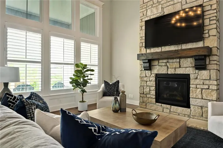 +"PublicRemarks": "This gorgeous 1.5 story home by James Engle is ABSOLUTELY TURNKEY and ready for move in! BRAND NEW REFRIGERATOR, DISHWASHER, CARPET, ALL ABOVE GROUND PAINT AND REFINISHED REAL HARDWOOD FLOORS! Built with beautiful finishes and upgrades like quartz countertops, solid stone fireplaces inside and outside, upgraded plantation shutters, and utility sink in laundry! This floor plan features a spacious prep and walk-in pantry, expanded mudroom with 8 cubbies and drop zone, loft area upstairs and beautiful vaulted ceilings. The large finished basement has a bedroom and full bath, flex room perfect for an additional office or craft room, oversized glass front exercise room, and living space with theater equipment with built in surround speakers perfect for movie nights! Outside is a covered patio with an extended patio and a stunning stone wood burning fireplace all in a fully fenced backyard. Light, bright, and feels like a new build sitting just around the corner from the community pool, playground and clubhouse!"