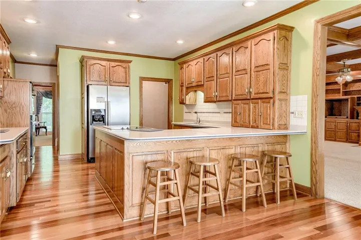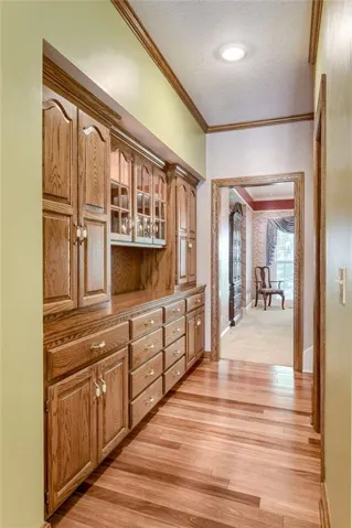 +"PublicRemarks": "Welcome to this pristine, custom-built, one-owner home, located in a serene neighborhood in Gladstone. This exceptional residence boasts 5 oversized bedrooms, each with walk-in closets, 4 full baths, and 3 half baths, offering ample space and luxury for your family's needs. The main floor is adorned with beautiful Brazilian Teak floors that flow through the entryway, hallway, and kitchen. The chef's kitchen is a highlight, featuring custom-built cabinets, an eat-in dining area, and a large island perfect for culinary creations. The lower level is completely finished and includes a full-sized kitchen, making it an ideal space for entertaining guests, hosting game-day gatherings, or enjoying a round of pool. The exterior of this all-brick home ensures low maintenance, while the screened-in porch provides a relaxing spot to enjoy the view of the meticulously maintained lawn and flower beds. With abundant storage space and a third garage access for lawn equipment, this home is designed for convenience and ease. Numerous amenities await you in this stunning property. This home is truly a must-see! Schedule your showing today and experience the unparalleled quality and comfort of this remarkable residence."
