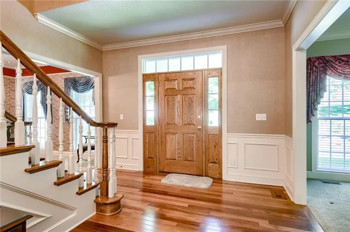 "LongDescription" => "Bedroom with ornamental molding and wood-type flooring"