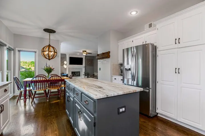 "LongDescription" => "Kitchen with white cabinets, hanging light fixtures, dark stone countertops, dark wood finished floors, and a center island"