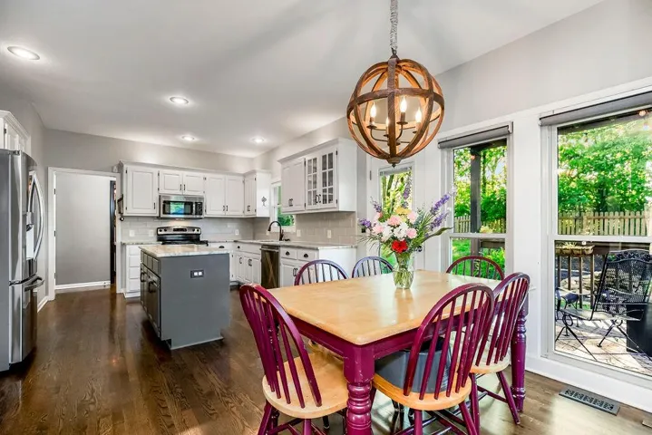 "LongDescription" => "Kitchen featuring white cabinets, recessed lighting, hanging light fixtures, dark wood-type flooring, and decorative backsplash"