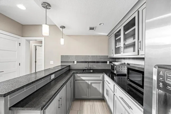 kitchen features abundant cabinetry, a center island, and views of the private backyard. All bedrooms are generously\r\n