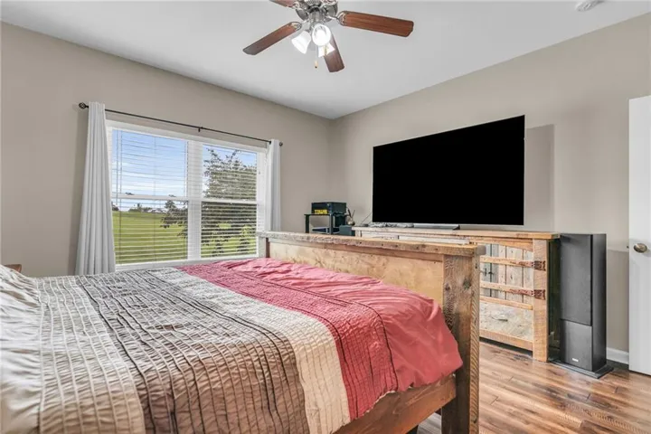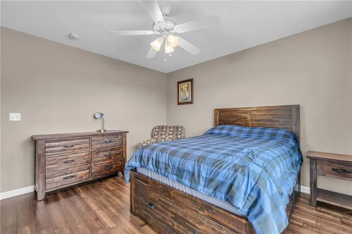 "LongDescription" => "Bedroom featuring wood walls, a textured ceiling, ceiling fan, and wood finished floors"