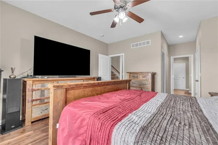 "LongDescription" => "Bedroom featuring light wood-type flooring, ensuite bathroom, a textured ceiling, and ceiling fan"