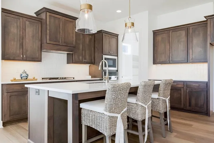 "LongDescription" => "Kitchen with decorative backsplash, white cabinets, pendant lighting, ornamental molding, and a kitchen island with sink"