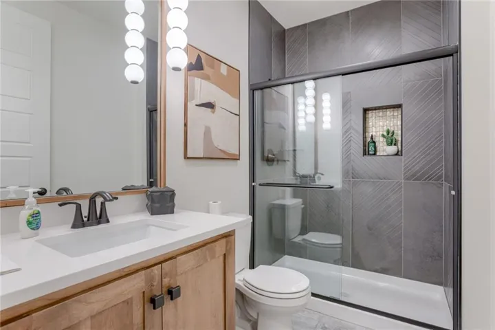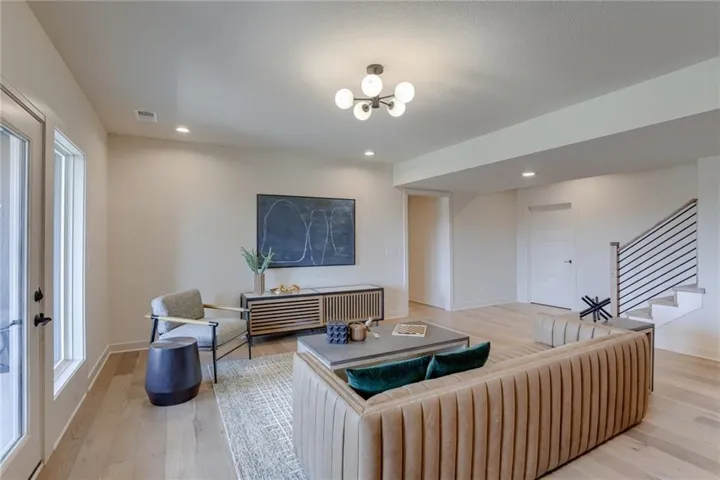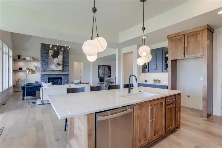 +"PublicRemarks": "Welcome to the "Campbell" Reverse, an exquisitely designed reverse by Rodrock Homes. Nestled on a private, exclusive street. This open-concept living with upgraded modern amenities, offering a truly luxurious lifestyle. Step into a bright, open floor plan where hardwood floors flow throughout, adding warmth and sophistication. The Great Room and Dining Room area is flooded with natural light thanks to a stunning wall of windows. Gather around the magnificent Designer Tile-front fireplace that stretches from floor to ceiling, complemented by trendy floating shelves and a floating hearth. A large mirror in the stairwell enhances the light and space. The culinary space is designed for both function and beauty, featuring a large center island perfect for meal preparation and entertaining guests. The main-level master suite offers ultimate convenience and comfort, featuring a huge walk-in closet and a luxurious master bath with a double vanity (with center drawers) and a large walk-in shower equipped with two shower heads. This home sits on a premium walk-out lot, perfectly connecting your lower level to the outdoors. Enjoy relaxing or hosting on the low-maintenance composite deck. The lower level is dedicated to relaxation and entertainment. A versatile rec room is the ideal spot for a home theater, game room, or fitness area. The sophisticated wet bar makes hosting a breeze, adding a touch of custom luxury. Two additional generously sized bedrooms and two full bathrooms offer privacy and convenience for guests or family members. WALKOUT LOT. PICTURES AND VIRTUAL TOUR ARE OF PREVIOUS MODEL HOME, WHICH DOES FEATURE UPGRADES. Forest View-a Premier Rodrock Community featuring Moms Council Events, Water Park, Zero Entry Pool, 50 ft Waterfall Entrance, Sand Volleyball, Playground & Picnic areas. Basketball & Pickle Ball Court. Cedar Niles Park/Walking Trails is accessible within the Community and Lake Olathe Nearby. MODEL HOME NOW FOR SALE! THIS HOME CAN CLOSE IN 45 DAYS."