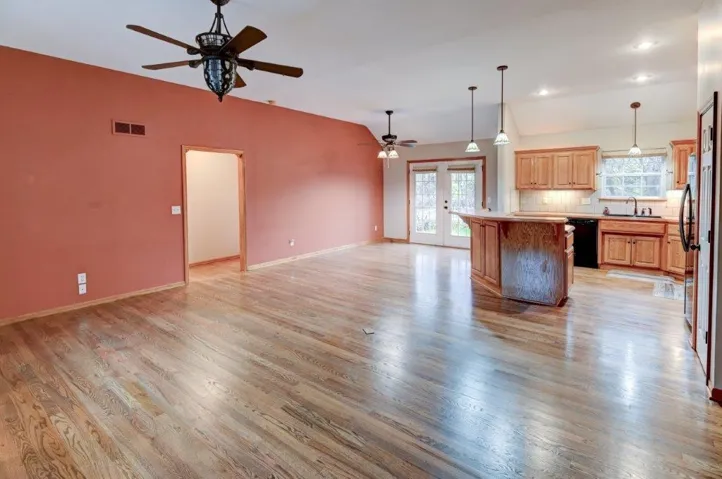 "LongDescription" => "Kitchen featuring appliances with stainless steel finishes, open floor plan, ceiling fan, light wood finished floors, and backsplash"