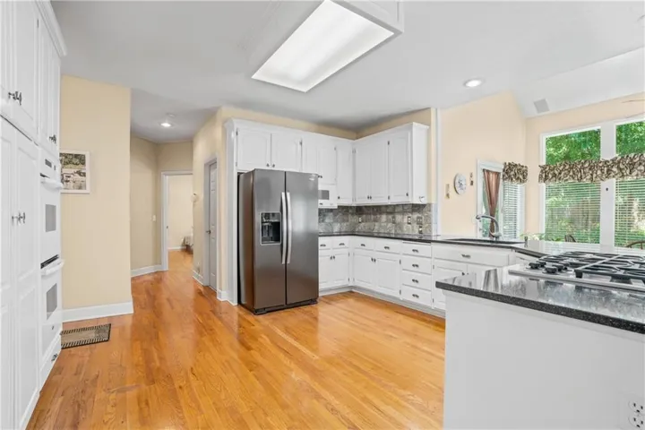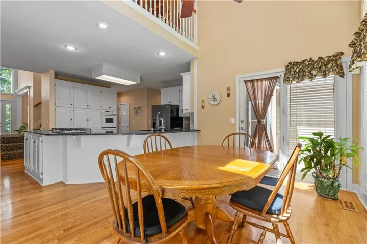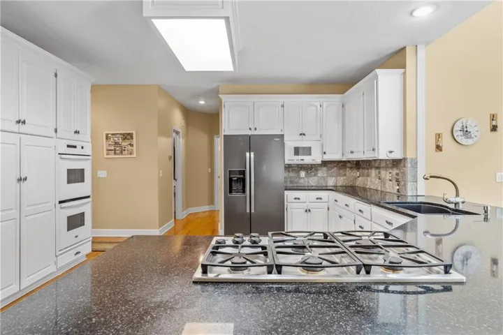 +"PublicRemarks": "Outstanding Leawood location with the perfect 1.5-story plan! A grand 2 story entry greets you with wood floors through much of the main floor. This floorplan flows effortlessly from the great room, kitchen, and dining rooms, making entertainment a breeze. In the center of the white, open kitchen is an expansive granite counter that keeps the cook at the center of the action with a gas cooktop and new double ovens. Spacious pantry with pull-outs and loads of storage space. Natural light fills the breakfast nook from the vaulted ceilings and skylights overhead and overlooks the patio and landscaped backyard through the wall of windows. With the spacious primary suite tucked away in the back of the home, it offers an additional 10x12 space that is perfect for an office or nursery. A generous-sized walk-in closet and bathroom complete the space. With over 4,400 total square feet, spaces like the upstairs loft and the finished lower-level offer plenty of space for your needs. Downstairs the open finished area features a wet bar, perfect for watching the big game or hosting game nights and there is still room for exercise equipment and storage. 2 water heaters less than 7 years old and AC 3 years old. So much here, you need to see for yourself!"