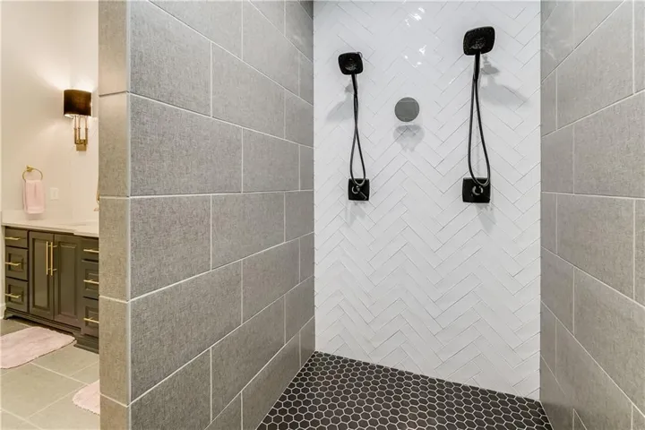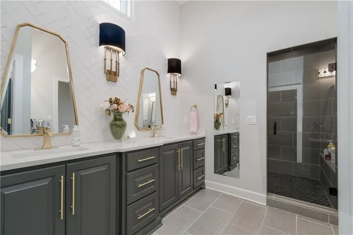 "LongDescription" => "Kitchen featuring gray cabinetry, decorative backsplash, stainless steel appliances, and light tile patterned floors"