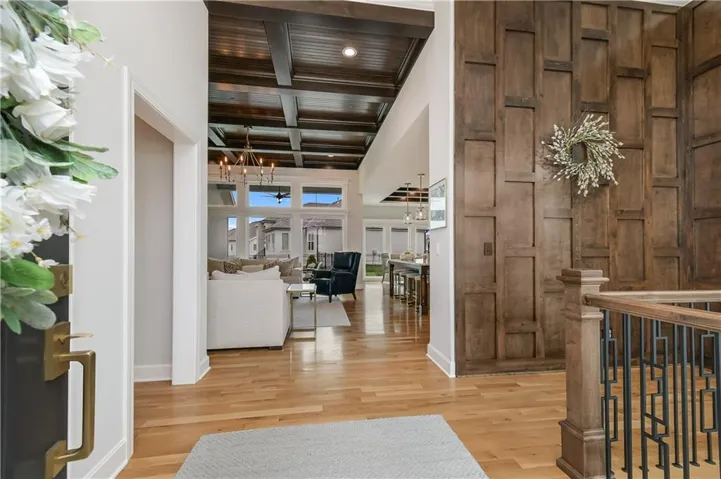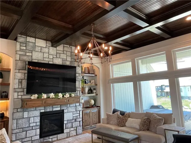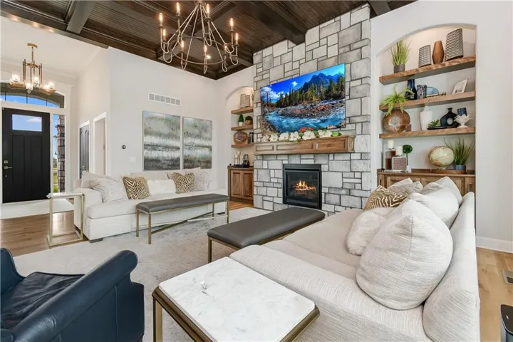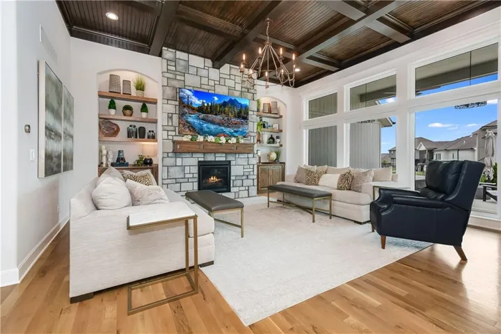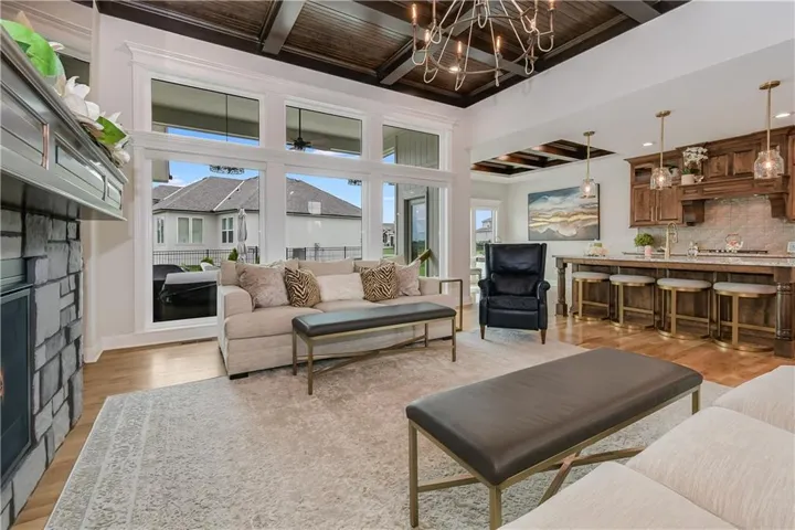 "LongDescription" => "Living area featuring wood finished floors and a chandelier"