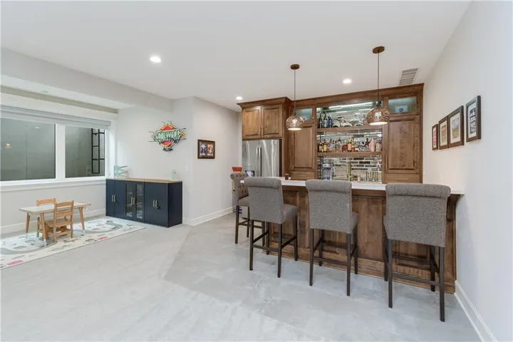 "LongDescription" => "Kitchen featuring gray cabinets, a kitchen bar, light tile patterned floors, and a brick fireplace"