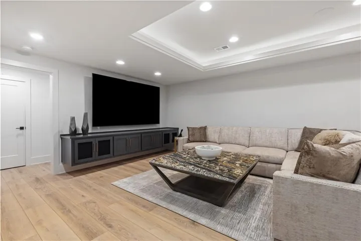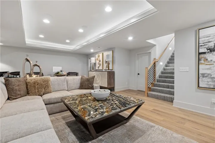 "LongDescription" => "Basement Living area featuring light carpet, ornamental molding, recessed lighting, and bar"