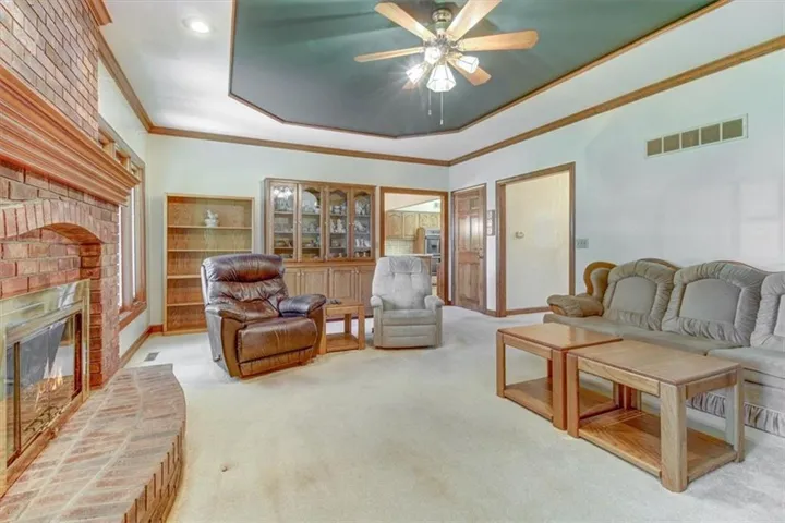 "LongDescription" => "Living area with wood finished floors, a fireplace, and crown molding"