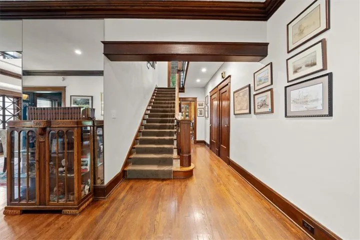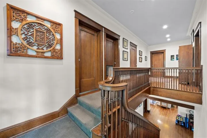 "LongDescription" => "Stairway featuring wooden walls, carpet, and wallpapered walls"