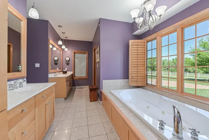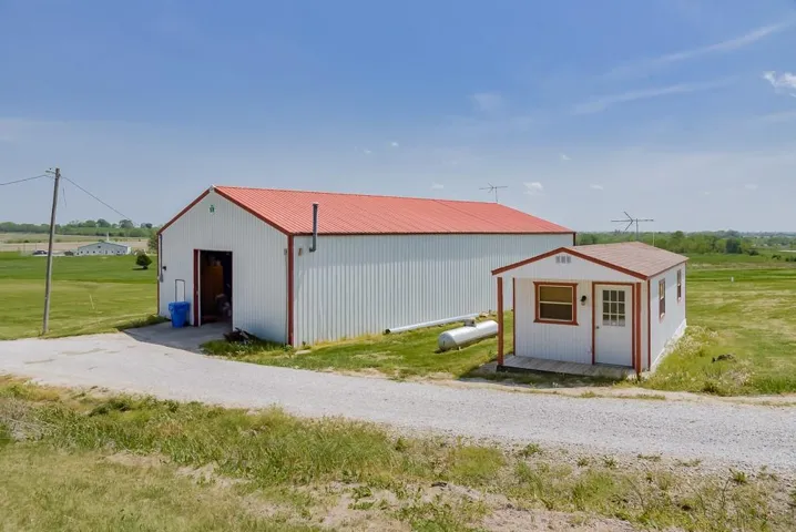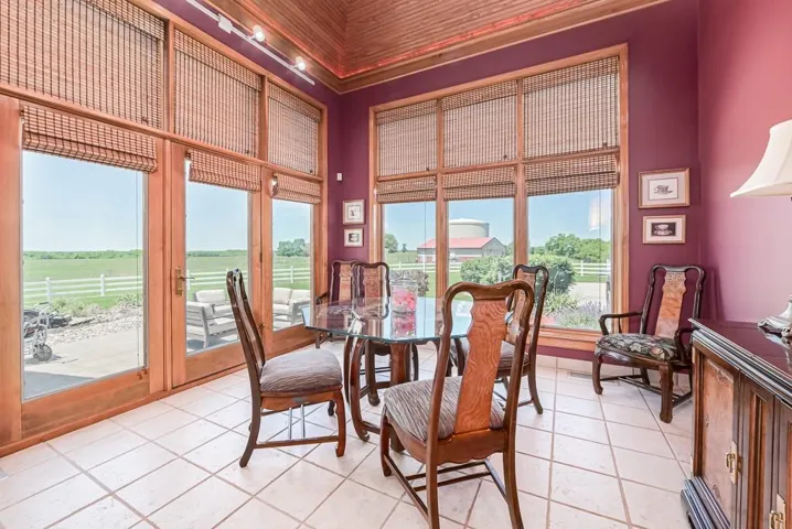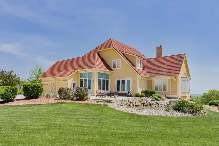 +"PublicRemarks": "GORGEOUS VIEW FOR MILES! This beautiful 4 bedroom sits on 42+ acres atop a bluff where you have views for miles in all directions plus pond, hay ground and wooded acres. Home features main floor bedroom suite with his/her walk-in California closets, marble bathroom with large walk-in double shower and jetted tub, custom cherry wood cabinets, granite counters and stainless steel Viking appliances in the kitchen. Breakfast room plus formal dining room, office with fireplace and custom cherry wood built-in cabinets, and a large living room! Upstairs offers a spacious sitting/game room with walk-in closet and 2 more bedroom suites each with private baths, walk-in closets and bonus rooms. Walkout basement offers HUGE rec room with fireplace and 2nd kitchen, 4th bedroom suite, and game room/family room! House zoned w/three separate HVAC systems. Lifetime metal tile roof. Property has 6 stall horse barn with tack room and fenced area, 72x40 barn, and 30x11 utility barn."