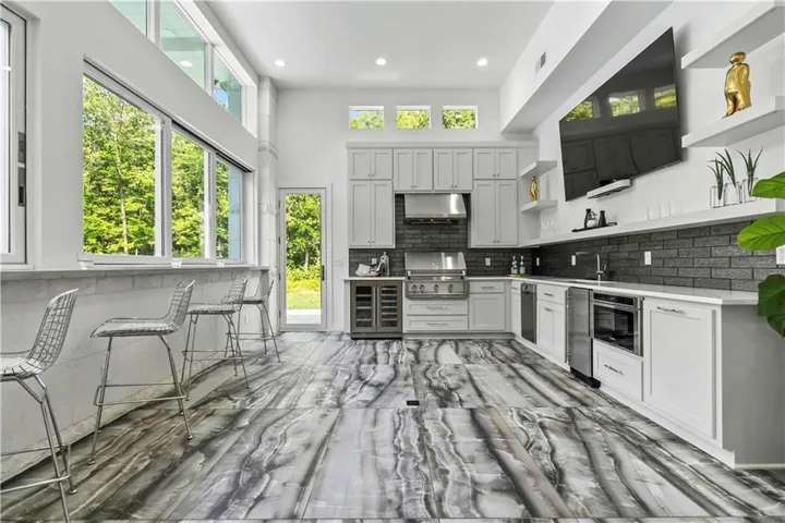 The resort-style indoor/outdoor kitchen, equipped with accordion windows, opens to a magnificent swim-up bar in the hot tub. Enjoy the luxurious gunite pool with a ledge lounge. \r\n