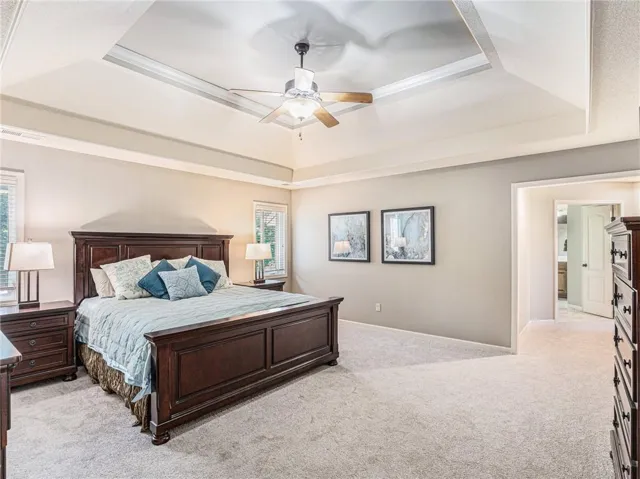 "LongDescription" => "Unfurnished bedroom with light wood-style floors, connected bathroom, a raised ceiling, and ceiling fan"