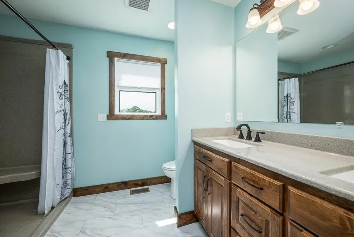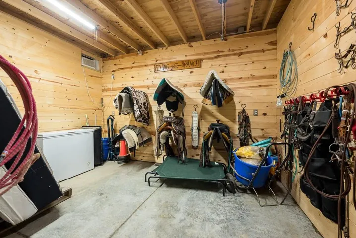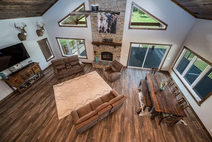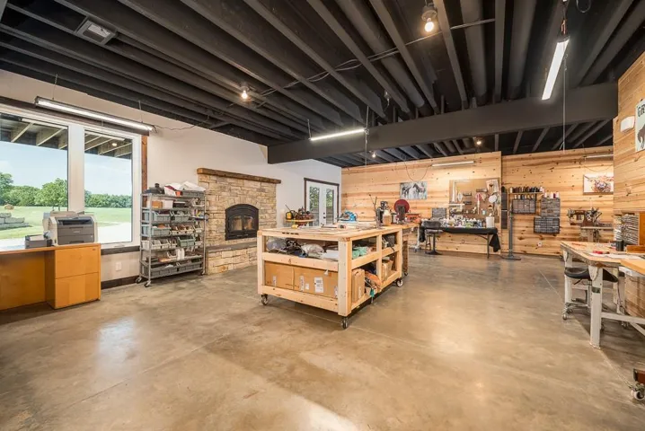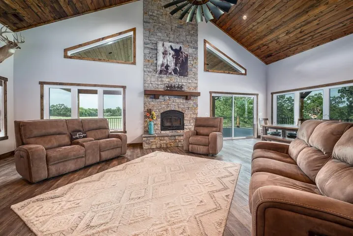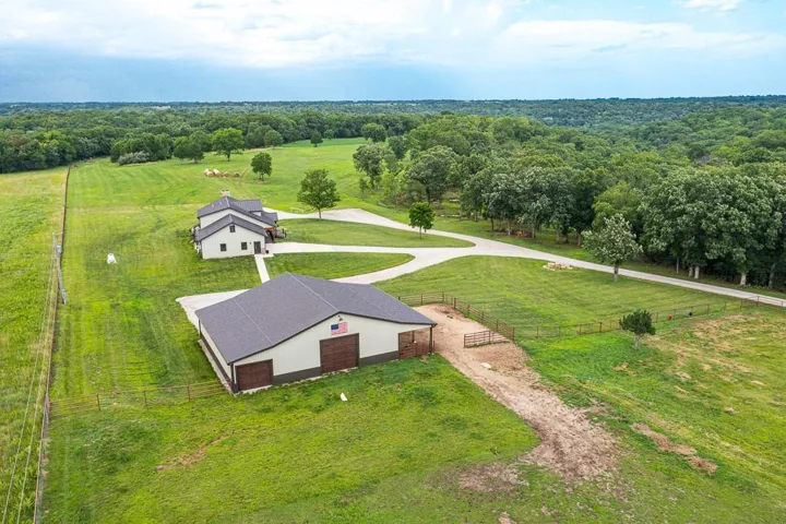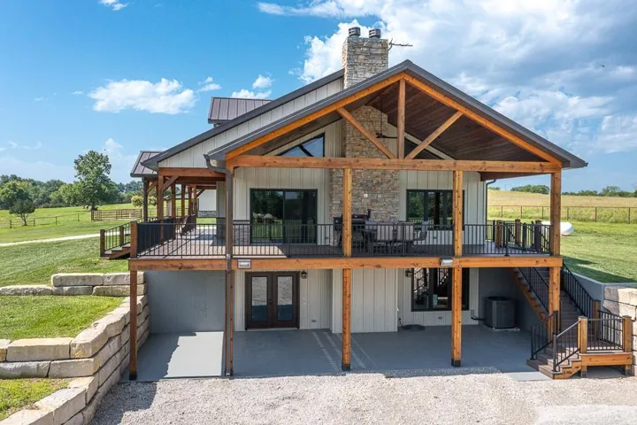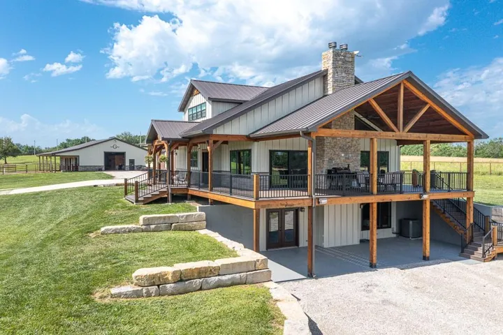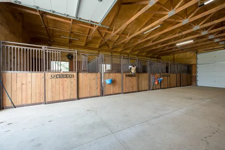 +"PublicRemarks": "NEWLY BUILT ESTATE HOME ON 53+ ACRES: A HORSE LOVER'S PARADISE! This exceptional 1.5-story home features 4 bedrooms and 3.5 baths, offering the perfect blend of luxury and rustic charm. The huge great room boasts a floor-to-ceiling stone fireplace and rustic wood-lined vaulted ceilings, creating a warm and inviting atmosphere. The chef's kitchen is equipped with an island, granite counters, and a walk-in pantry. The main level master suite includes his-and-hers closets and a private bath with double vanities and a shower, with the entire main level being handicap accessible. The second floor features 2 bedrooms, a family room area, and a loft that overlooks the great room. The walkout basement includes a 4th bedroom, full bath, and a workshop with a stone wood-burning fireplace. The home also has a wraparound covered deck, a 2-car garage with drive-through access, and a 60x48 barn with 4 horse stalls, a tack room, a horse wash rack, multiple large doors, and 45x48 paddock. The front field is 4.7 acres and has 2900 feet of smooth metal pipe fencing, ready for horses or livestock, and approximately 9+ acres are dedicated to hay ground, and lots of woods with ATV trails. This is the perfect retreat for those who appreciate both comfort and equestrian amenities."