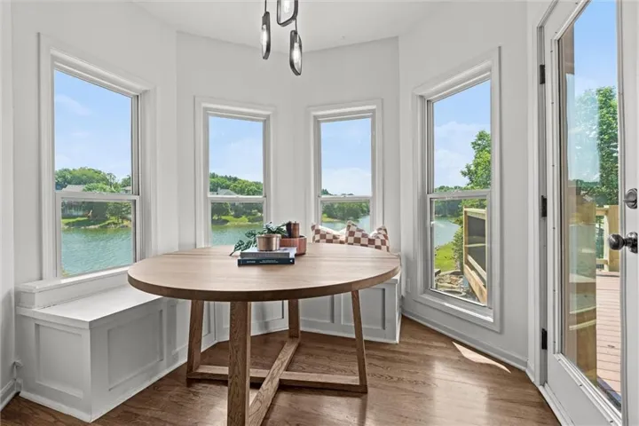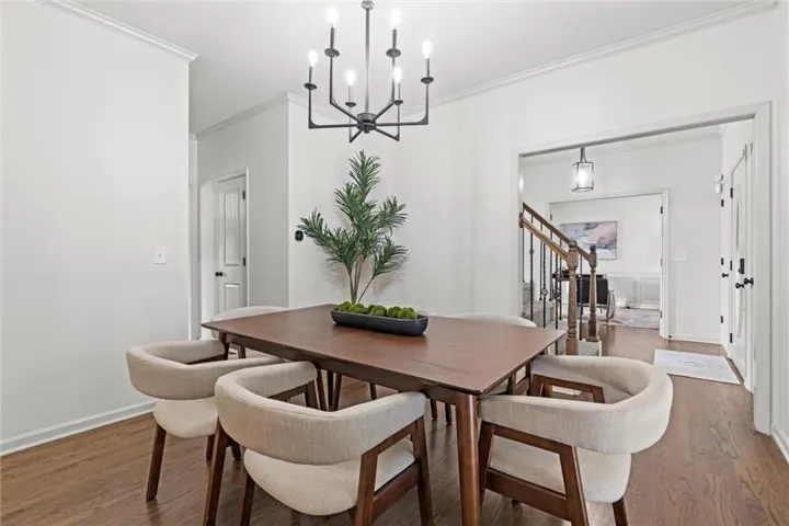 "LongDescription" => "Dining area with dark wood-style floors and ornamental molding"