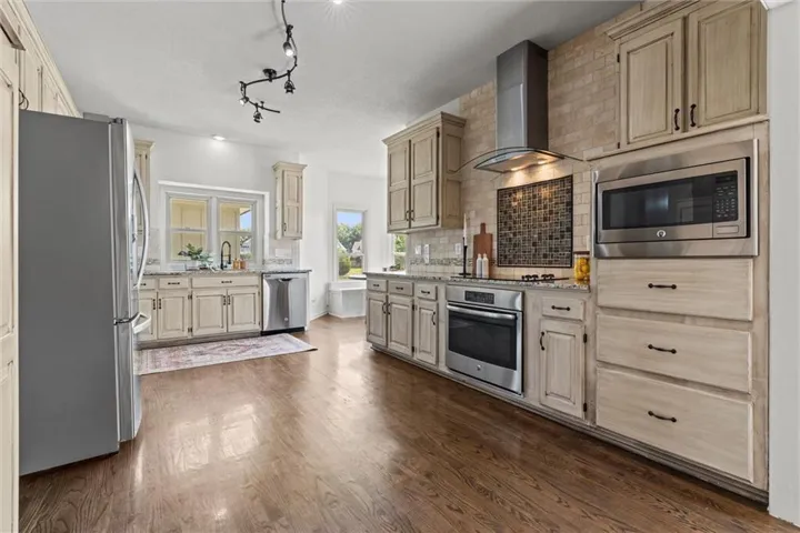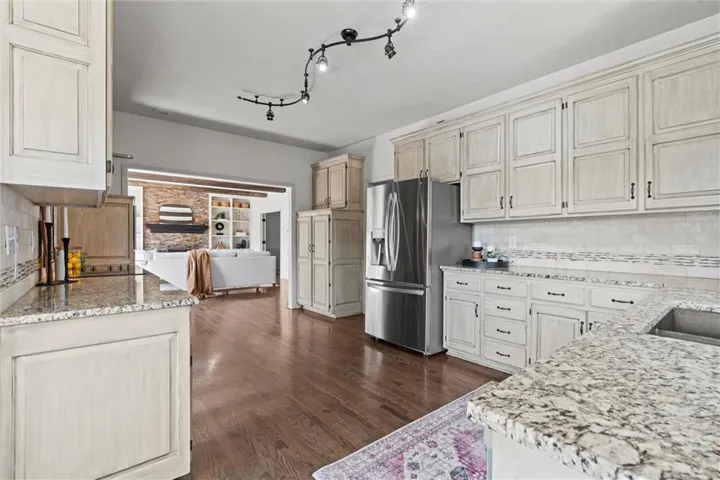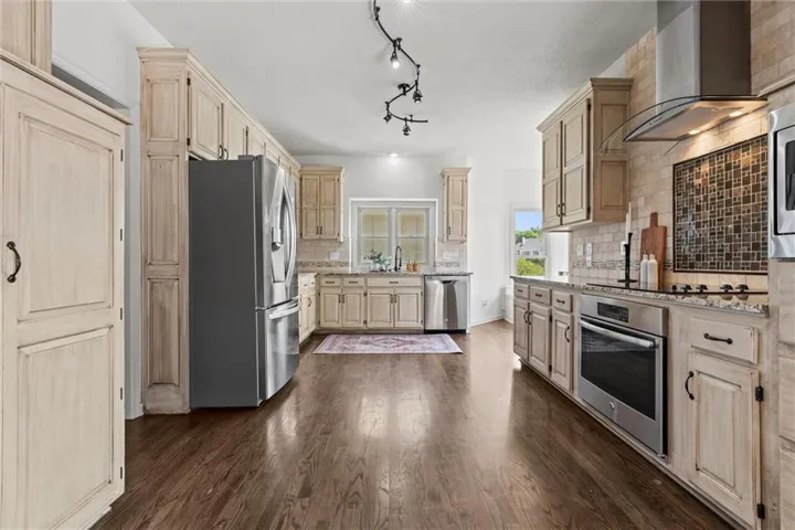 "LongDescription" => "Kitchen with stainless steel appliances, light stone counters, dark wood-type flooring, ornamental molding, and tasteful backsplash"