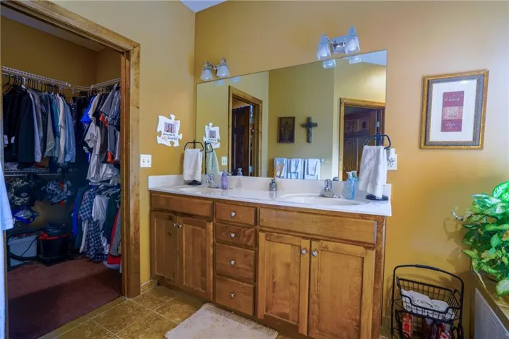 "LongDescription" => "Bathroom featuring vanity, tile walls, wallpapered walls, a textured ceiling, and wainscoting"
