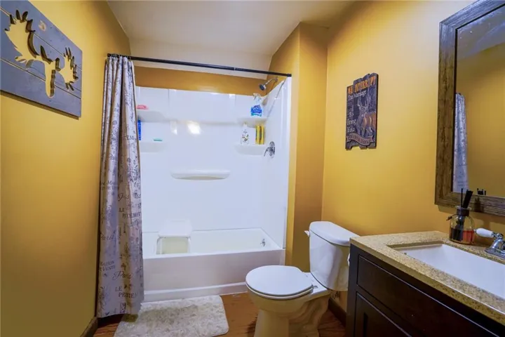 "LongDescription" => "Bathroom with vanity, a shower with curtain, tile walls, a textured ceiling, and a wainscoted wall"