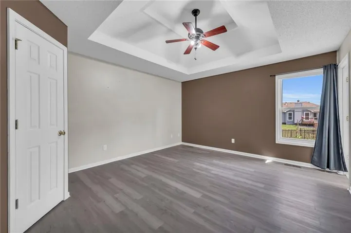 "LongDescription" => "Unfurnished living room featuring a tray ceiling, ceiling fan, and dark wood-type flooring"