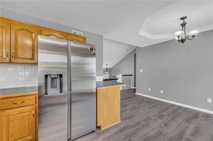 "LongDescription" => "Kitchen with light stone counters, wood finish cabinetry, stainless steel appliances, decorative backsplash, and dark wood-style flooring"