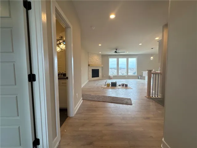 "LongDescription" => "Kitchen with sink, light hardwood / wood-style flooring, a kitchen island with sink, a fireplace, and decorative light fixtures"