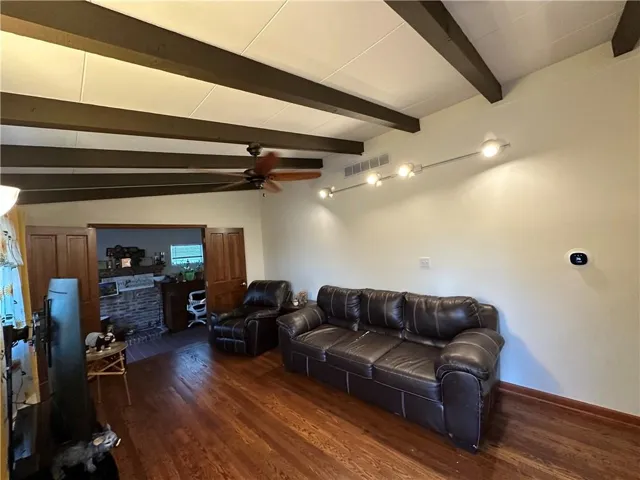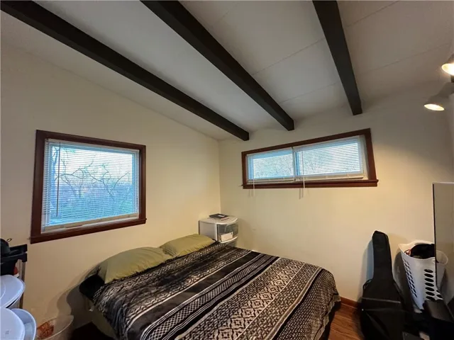 +"PublicRemarks": "Charming home on huge double lot! Walk right in to a bright living area with true hardwood floors & gorgeous dark wood beams on ceiling. Beams are carried into bedrooms and additional family room. Breakfast area with tile flooring. Two pantry's plus tons of kitchen cabinets, tile back splash. Skylight in bathroom. Third bedroom and storage room in the basement . Laundry in basement with added sink. Huge backyard with so many possibilities. Wisteria tree grown over pergola for extra shade and artistic effect. Vinyl siding. A must see home!"