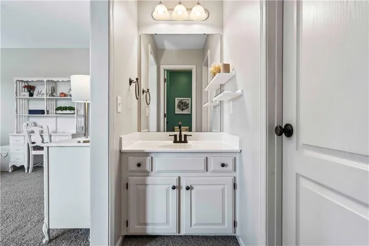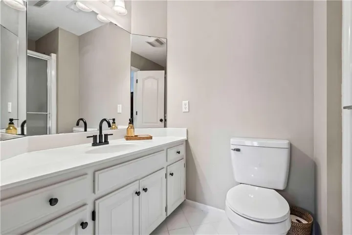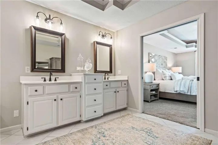 "LongDescription" => "Full bathroom featuring two vanities, suspended lighting, a walk in closet, a shower with shower door, and light tile patterned floors"