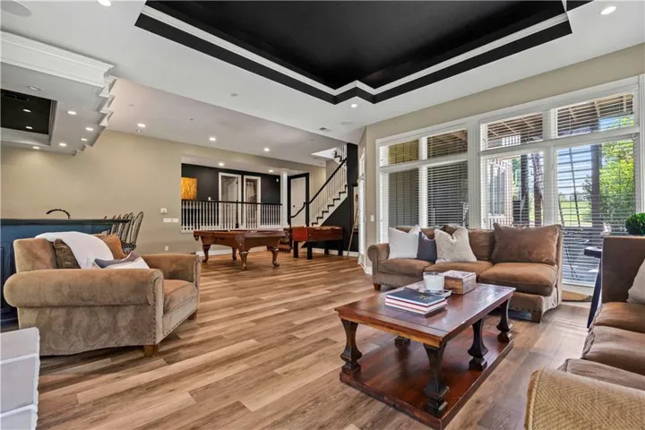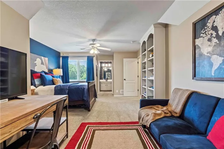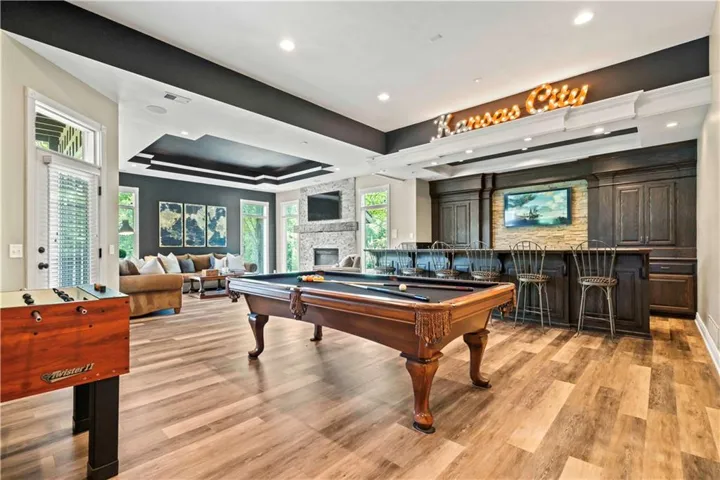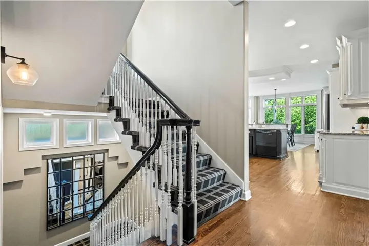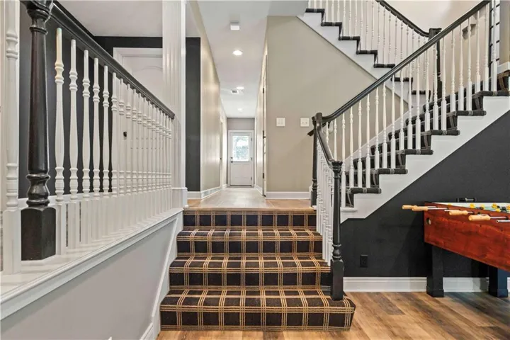 Enter through a grand foyer with a curved staircase leading to formal dining and living rooms. The spacious kitchen features granite countertops, two walk-in pantries, and a cozy hearth room with fireplace. A home office, laundry room, drop zone, and a half bath complete main level. Upstairs, the primary bedroom has an ensuite bathroom with a walk-in shower & closet, dual vanity, and jetted tub, along with three additional large bedrooms all with walk-in closets and built-in cabinetry. A laundry chute offers extra convenience! The second staircase leads you to the tiered basement with two more bedrooms, bathroom, home gym, entertainment space, full bar and storage. The crowning jewel of this home is the outdoor space. The driveway wraps around the home into the lower-level suspended garage, ideal for entertaining. It's complemented by the oversized patio, deck, fire pit, and expertly groomed yard with a sprinkler system. The original owner, who was the builder, packed the home with extras. The current homeowner has maintained it with pristine care and many updates, making this home move-in ready. Recent updates include three new HVAC units, each heating and cooling every level of the home, a new septic tank, hard surface flooring on the lower two levels, rear siding replaced with cement fiber siding for maintenance-free years to come, a composite deck with wrought-iron spindles, fire pit addition, new paint throughout (interior and exterior), and many updated fixtures, hardware, and overall home updates. Come see for yourself!
