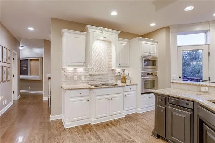 "LongDescription" => "Kitchen with open shelves, white cabinets, light wood-type flooring, and light stone countertops"