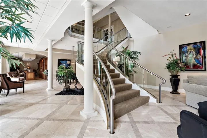 Situated on a private point in the West Shore of Riss Lake, this elegant lakefront residence spans 11,700 sq. ft. on 1.22 acres of beautifully maintained wooded landscape. Nestled within a private gated community, you'll be immediately impressed by the stunning exterior, impeccable circular drive, and custom glass entry. Inside, this meticulously designed home impresses at every turn. From the incredible custom stainless steel and glass staircase to the expansive entertainment area, this home is truly one-of-a-kind. Flooded with natural light, it boasts soaring ceilings and walls of windows. On the main level, you'll find a formal living and dining room, a large office, a separate den, a cozy hearth room, a designer kitchen with Viking and Sub Zero appliances, and a beautiful sunroom with incredible views. The Owner's suite is a retreat filled with special details such as custom ceiling features, a lovely sitting room, expansive closets, a whirlpool tub, and more. The upstairs features a large loft area and three spacious bedrooms, each with private baths and walk-in closets. This home also includes a large gym, a playroom, and a fabulous home theater. \r\n