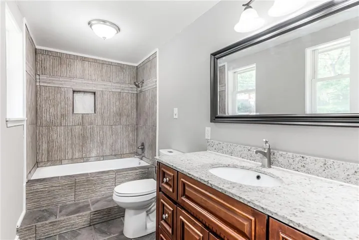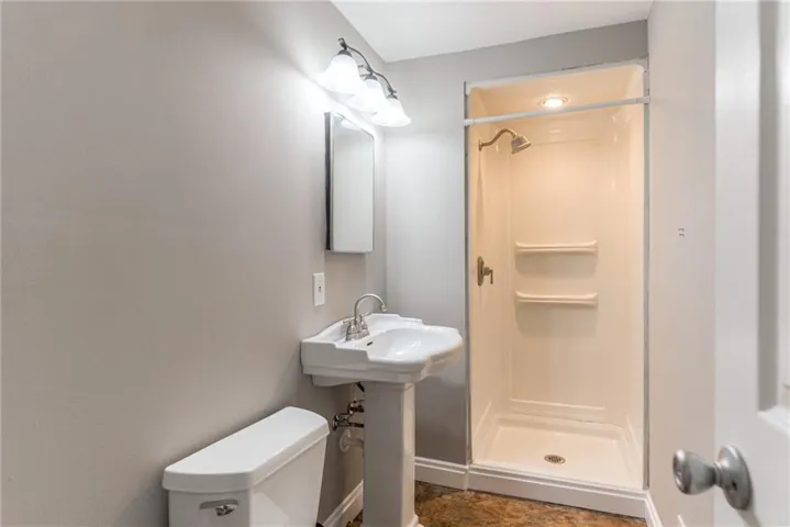 "LongDescription" => "Full bath with plenty of natural light, vanity, a shower stall, a textured ceiling, and tile walls"