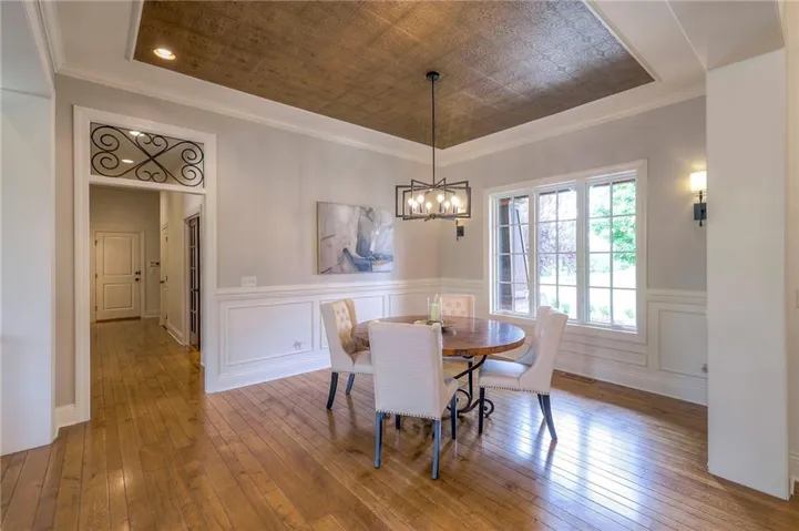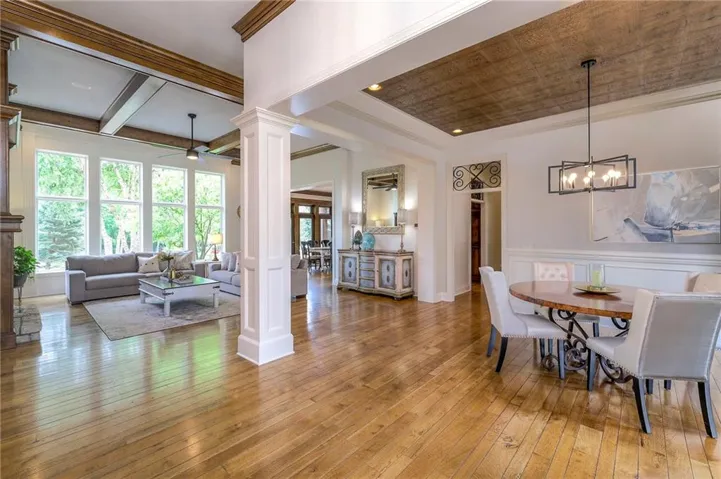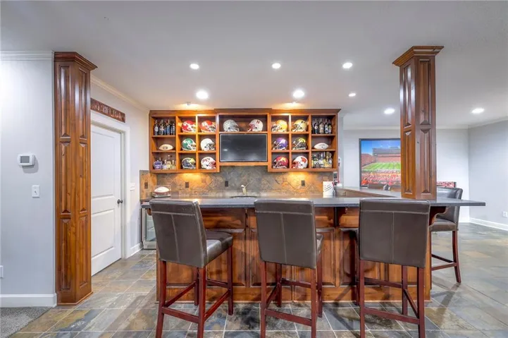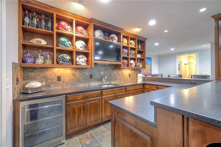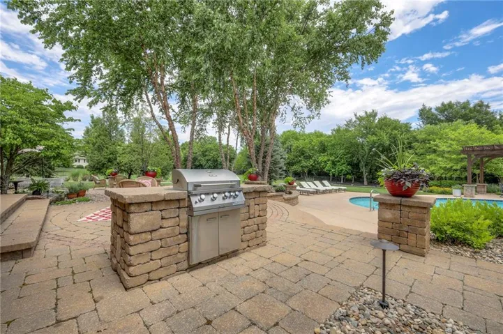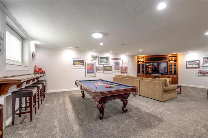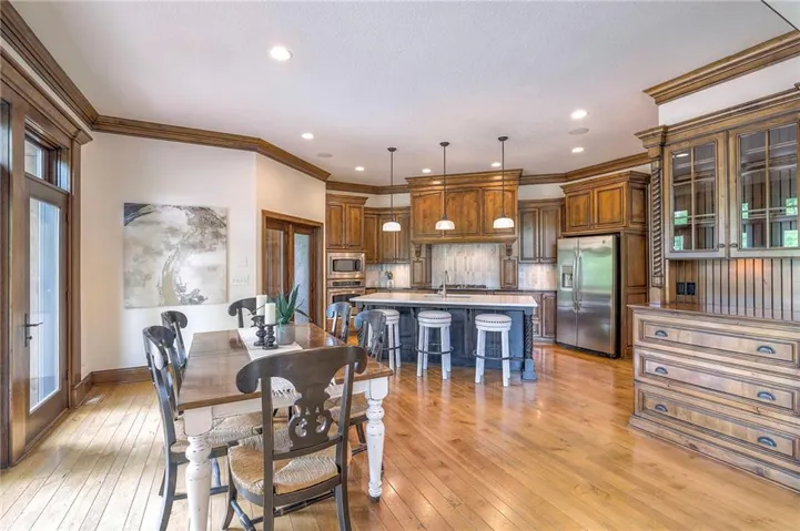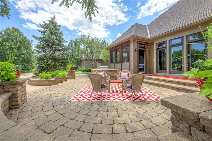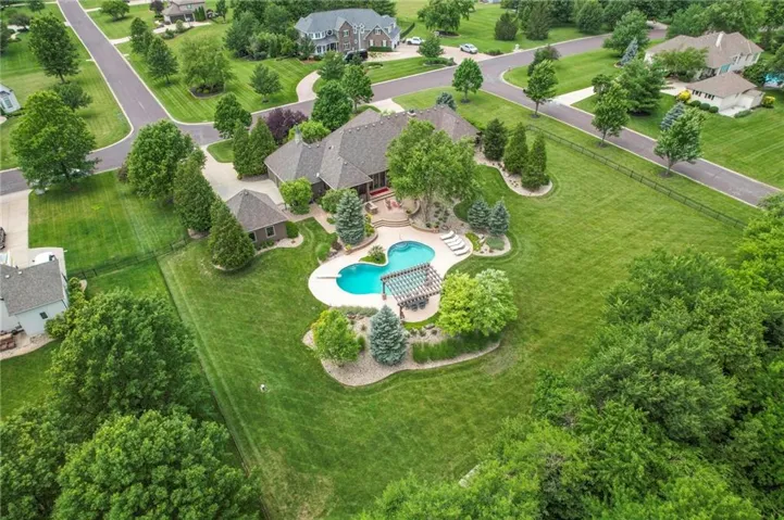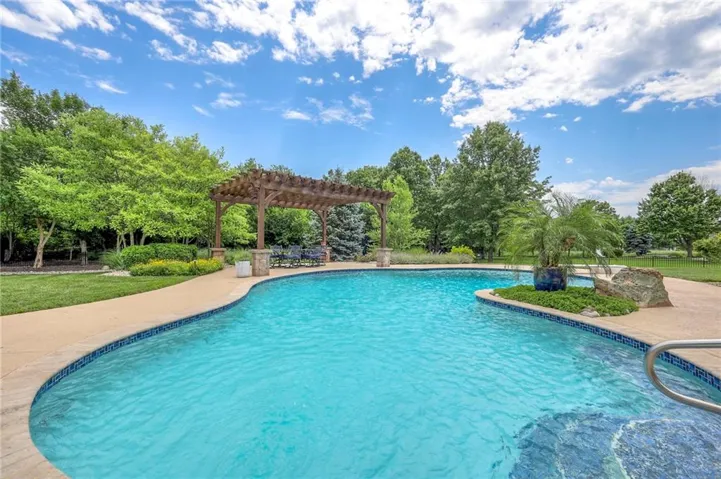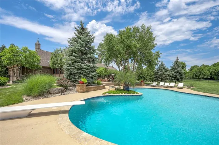 +"PublicRemarks": "Welcome to luxury living at its finest! This stunning 4-bedroom, 4.5-bathroom home boasts a unique reverse floorplan, situated on a private estate lot with a picturesque backdrop. As you step inside, you'll be greeted by an open floorplan featuring soaring ceilings & an abundance of natural light that fills the sundrenched rooms. The gourmet kitchen is a chef's dream, complete with a spacious island, pantry, custom cabinets, gas range, & stainless steel appliances. The great room is the heart of the home, offering a cozy gas fireplace & a wall of windows that overlook the breathtaking backyard. The screened porch, perfect for entertaining or simply enjoying the serene surroundings. The primary suite is a true retreat, featuring a spa-like bath with two walk-in closets, a whirlpool tub, & built-ins. An additional bedroom on the first floor with an ensuite, a spacious laundry room with built-ins, & a first-floor office provide convenience & comfort. The lower level is an entertainer's paradise, featuring a family room with a full custom bar, two additional bedrooms with ensuites, a workout room or flex space, ample storage, & a storm shelter. Not to be missed is the back stairway from the lower level to the 3-car garage, as well as the additional detached 2-car garage. Walkout/walkup to the picturesque backyard, complete with a paver patio leading to the custom inground pool w/diving board, surrounded by lush landscaping & multiple sitting areas including a pergola for shade & a gas firepit for evening gatherings. You will find the additional detached 2 car garage making a total of 5 car garage space or use the detached garage as a shop/hobby space. This exceptional property also offers access to a neighborhood pond stocked with fish & scenic trails. Don't miss the opportunity to make this stunning residence your own & experience the epitome of luxury living."